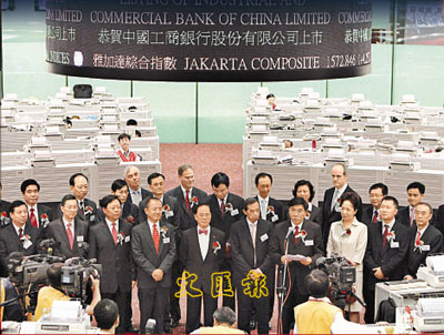 ■內地最大國有商業銀行--中國工商銀行去年10月成功在港滬以A+H股同步上市,開創歷史先河,掀起市民認購狂潮。圖為其上市掛牌儀式冠蓋雲集,特首曾蔭權也親自到場致賀。