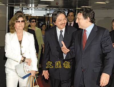 ■歐盟主席巴羅佐抵達香港訪問,時任工商及科技局局長的曾俊華(圖中),在港澳碼頭迎迓。