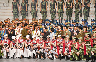 【本報訊】為慶祝香港回歸及中國人民解放軍進駐香港十周年,解放軍戰士文工團昨晚在紅磡體育館上演大型文藝晚會《神聖》,再現香港回歸歷史,展現駐港軍人風采。當晚演出陣容鼎盛,宋祖英等著名軍旅藝術家登台獻藝,共有260多位演員參與演出,香港特區行政長官曾蔭權及夫人、外交部駐港特派員呂新華及夫人、解放軍駐港部隊司令員王繼堂、政委張汝成等與數千名香港各界人士及市民一起觀看精彩演出。