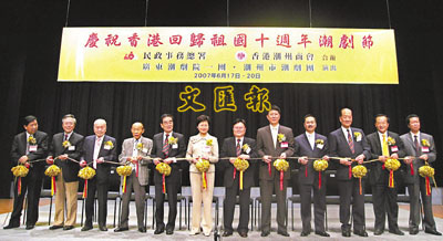 馬介璋會長在開幕禮上致辭時表示,今年是香港回歸祖國10周年。這10年來,香港成功落實「一國兩制」、「港人治港」。在中央政府大加支持下,在特區政府以及全港市民的不懈努力下,香港經濟復甦,各行各業穩健發展。香港潮州商會作為香港大家庭中的一分子,舉辦一系列慶祝活動,以表達潮籍人士歡欣喜悅的心情。今次與民政事務總署聯合舉辦的潮劇節,特邀廣東潮劇院一團和潮州市潮劇團,這兩大最具實力之潮劇團蒞港為廣大鄉親及市民傾力演出。商會希望大家在觀賞潮劇之餘,更能增進鄉誼,凝聚同鄉力量,共享回歸10周年歷史性的歡慶日子。