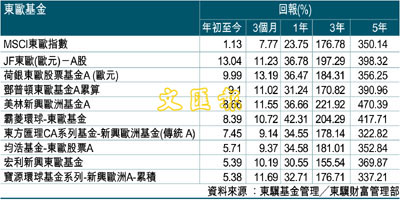 鄧普頓東歐基金的投資組合則較分散,匈牙利、俄羅斯及土耳其各佔組合的24%,風險較低,年初至今回報達9.1%,同樣跑贏大市。如果各讀者看好東歐表現,不妨以趁回調時吸納。但讀者亦需注意,東歐的股市及東歐基金的波幅不低,一般而言都會有15%至30%的波幅,若投資者對當地市場了解不多,投資前宜先向理財顧問查詢。 ■東驥基金管理部