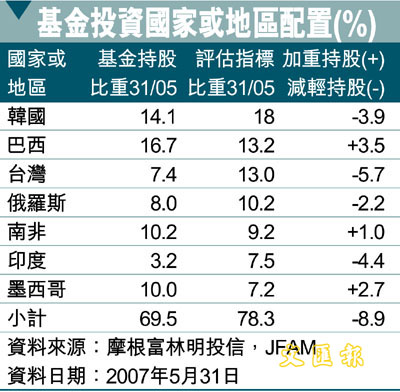 基金投資國家或地區的比重相對指標指數比重而言(依加重/減輕持股幅度排序):巴西(+3.5%)>墨西哥(+2.7%)>南非(+1.0%)>俄羅斯(-2.2%)>韓國(-3.9%)>印度(-4.4%)>台灣(-5.7%),未來可能加碼持股相對較低的台股。