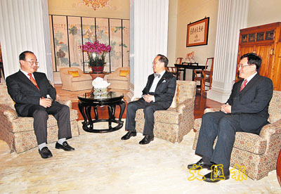 行政長官曾蔭權(中)昨日上午在禮賓府會見訪港的衛生部部長高強(左),就內地與香港醫療衛生服務的合作事宜交換意見。衛生福利及食物局局長周一嶽(右)參加會見。