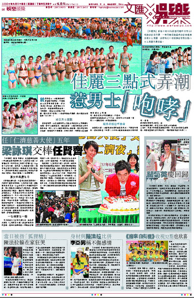 佳麗落水後,10號黃彥欣因穿粉紅色泳衣,下體隱約現形,曾在記者會「失禮」人前的14號趙嘉迪在玩水泡沖浪時,被巨浪沖到比堅尼泳衣移位,在池中喊起救命來,多位工作人員即上前為她圍上毛巾,事後才知是趙嘉迪過於敏感,泳衣並未有移位或鬆開,再度受責她只好可憐地謂:「媽咪話有事就大叫嘛!」