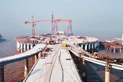 ■建設中的杭州灣跨海大橋海中平台。本報記者 攝