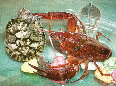 ■山東省棗莊市一居民家中飼養了一隻小烏龜和龍蝦,在魚缸內一起生活了一年多,經常一塊嬉戲打鬧,十分有趣。本報山東通訊員吉哲