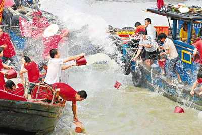 ■福建石獅古渡口,近兩千人在漁船上潑水狂歡,驅熱消暑,祈求吉祥。資料圖片