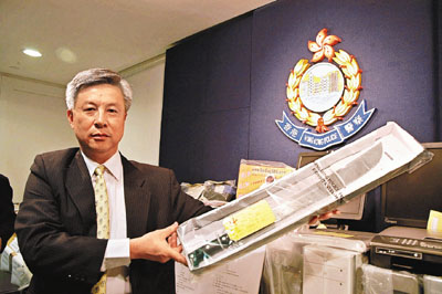 ■香港警方有組織罪案及三合會調查科總警司蔡建祥展示在代號「雷霆07」行動中所檢獲的武器。