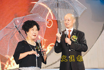 ■京劇名票李尤婉雲與上海京劇院名角關懷冒著滂沱大雨在尖沙咀文化中心露天廣場舉行的慶回歸十周年演唱會上,合唱京劇《四郎探母》選段《坐宮》。