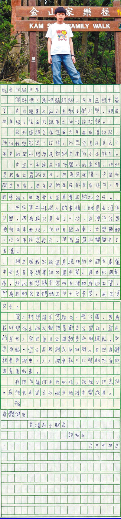特區10齡兒童言寄胡總 (圖)