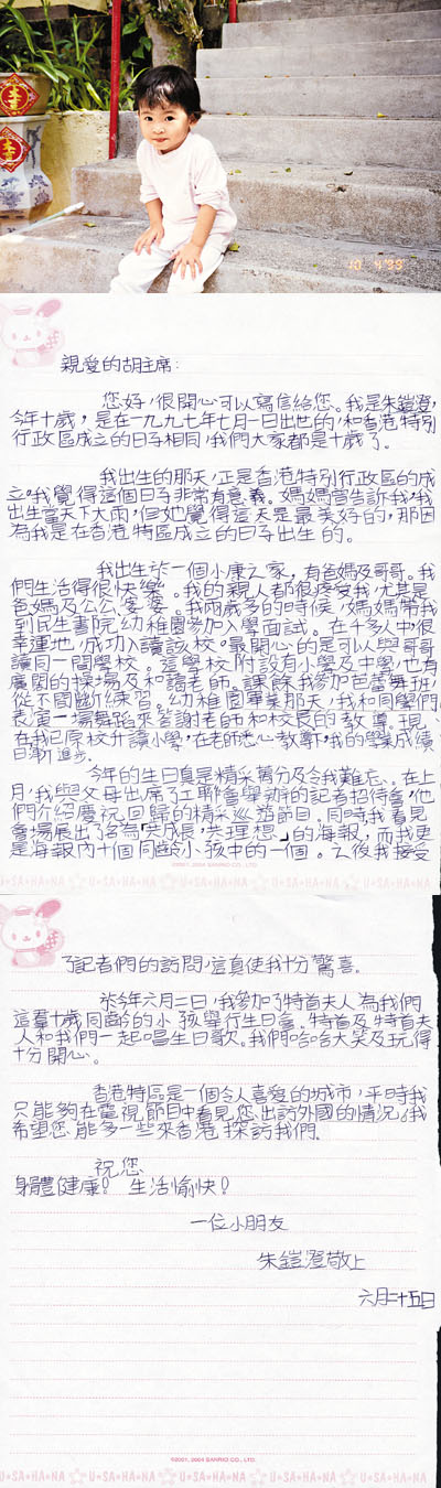 特區10齡兒童言寄胡總 (圖)