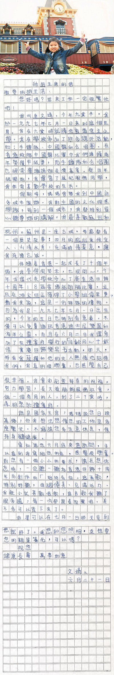 特區10齡兒童言寄胡總 (圖)