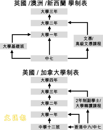 至於選擇到美國或加拿大升學而其成績又未達到大學入學要求的中七學生,可修讀2年制的副學士學位課程 (Associate Degree)或大學轉讀課程 (University Transfer Program)。美國的副學士學位課程入學要求為香港中五程度,而加拿大的入學要求則一般為香港的中六或中七程度。學生在完成兩年制的副學士學位課程後,一般可獲得學分豁免,直接升讀當地大學的三年級 (美加大學一般為4年制)。至於能考進哪一所大學,這當然要視乎學生的副學士成績而定。但過往亦有學生考進很多著名的大學,如美國的UCLA、UC Berkeley或加拿大的UBC、Simon Fraser University等。(請參考附設的美加學制表)