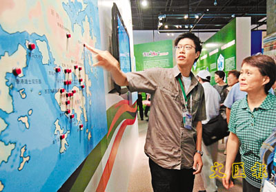 香港十年成就展正在北京展出。圖為香港理工大學學生司徒榮登(左一)在義務為北京民眾講解。新華社