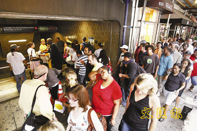 ■紐約市部分地區停電,地鐵服務一度暫停。在32度悶熱天氣下,市民抱怨政府沒有汲取去年停電的教訓。 彭博通訊社