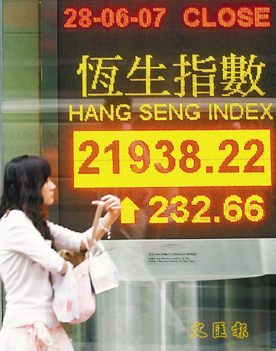 ■恆指昨早段最高曾升近330點,貼近本周一的歷史高位,惟收市升幅收窄至232點。中新社