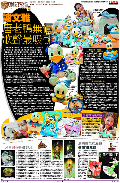 「在歌曲裡,感覺他是傻傻的﹔而在故事裡,他的本性善良,但有時又會做點調皮的動作,傻得非常可愛。不過,我卻喜歡他這種帶點『壞』的性格,有時貪心、有時撞板,但基本上都是純良的,甚至可愛呢。」開始收藏唐老鴨數年的謝文雅,向記者展示她百多件的「藏品」,記者卻從中發現與眾不同的唐老鴨——穿襪子的鴨。(那穿皮靴的貓是否也在附近?)