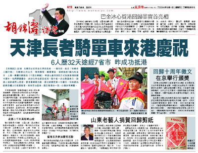 【本報訊】(記者 朱樂汶)6名來自天津的長者,一個月前,組成「快樂老人騎行隊」,在剛過去的32天,風雨兼程,騎著單車,途經超過7個內地省市,上演一幕慶回歸版的《千里走單騎》,希望以最特別的方式祝賀香港回歸十周年。他們歷盡艱辛,終於在昨日趕及抵港。隊中唯一的女隊員表示,路途上須經過荒山陡坡,要推著單車走路,這次經歷更是一生難忘。但她認為能夠身體力行祝賀香港,再辛苦也值得,踏足香港的一刻,心情非常興奮。