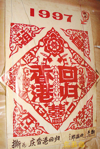 據鄭滋田的夫人邵淑宜介紹,這幅剪紙是1997年香港回歸之前,鄭老用了五天的時間手撕而成。香港回歸,對鄭家還有一層特殊的意義。邵淑宜稱,她的弟弟在台灣經商,骨肉分離了幾十年。弟弟第一次回大陸探親,就是辦的去香港的旅遊簽證,後來又托朋友幫忙才得以回來團聚。十年來,這幅剪紙一直被懸掛在鄭家的房頂上,背面用泡沫版撐著,正面用塑料包著,保存的十分精心。