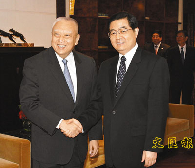 胡錦濤主席昨日上午在下榻的飯店與董建華會面。胡錦濤說,董建華是香港特別行政區首任行政長官,在行政長官的崗位上工作了近8年時間,為「一國兩制」在香港的成功實踐做了大量開創性工作。香港今天的良好局面與董先生在任時打下的工作基礎是分不開的。