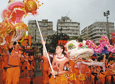 由九龍城區議會舉辦的慶回歸活動昨在賈炳達道公園足球場舉行,當時雖然大雨傾盆,但民眾興致高昂。圖為舞獅表演。 本報記者聶曉輝 攝