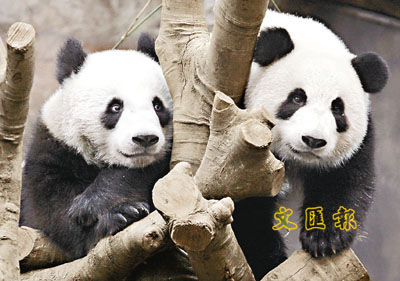 ■大熊貓盈盈和樂樂,在熊貓館嬉戲。 本報記者梁祖彝 攝