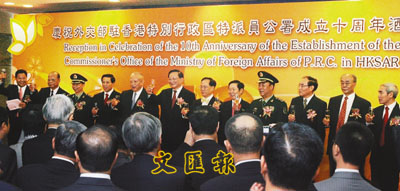 外交部駐港特派員公署昨日舉行慶祝公署成立10周年酒會。國務委員唐家璇、全國政協副主席董建華、香港特區行政長官曾蔭權、國務院港澳辦副主任陳佐洱、外交部副部長張業遂、駐港部隊司令員王繼堂和政委張汝成、全國人大常委曾憲梓、中央駐港聯絡辦副主任王鳳超及各界嘉賓約600人出席。其間,唐家璇國務委員和酒會「主持人」、外交部駐港特派員呂新華等與來賓進行了親切交談。