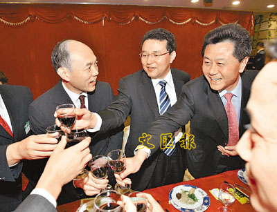 ■全國青聯常務副主席爾肯江(中)率領14省市青聯代表出席晚宴,與李剛(右)、霍震寰(左)相見歡。本報記者劉國權 攝