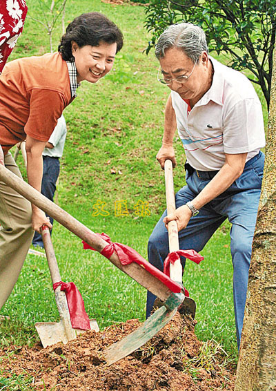 ■廣州市副市長王曉玲(左)同港商林建名種下紫荊樹。