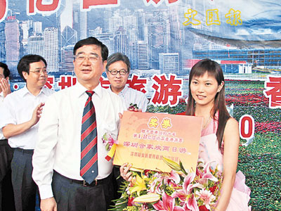 ■深圳市卓欽銳副市長向港遊客黎婉如頒發了「香港回歸十年第1.8 億位訪深香港遊客證書」。