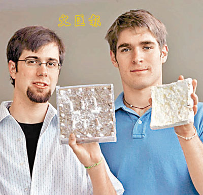 美國紐約維色列亞理工學院的研究員麥肯泰亞(左),手拿一種以水、麵粉及蠔菰籽、珍珠岩再加上泥土所酵成的隔熱物料,名叫「隔熱保」(Greensulate)。拜亞(右)則拿著已發酵好的成品模樣;雖然怎看也像一塊麵包,但研究成功就能配合現時的環保風。