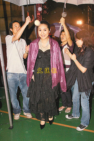 ■楊千嬅冒雨演出慶回歸,幸有工作人員為她打傘。