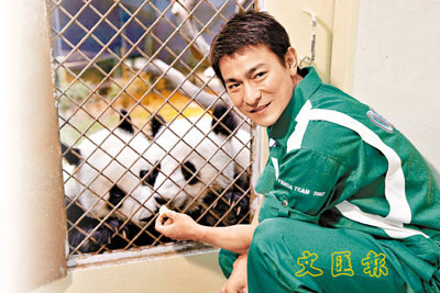華仔昨日清晨六點多便來到海洋公園做義工,照顧大熊貓。他換上一身熊貓謢理員制服,參與照顧大熊貓的工作,先是抬來大熊貓主食「竹葉」去洗,然後磅好一天要吃的份量,再去切水果,及學習製造港產大熊貓食品「窩窩頭」,接著他還為大熊貓掃房舍,又負責餵盈盈及樂樂吃東西,兩個多小時過得又忙碌又愉快。