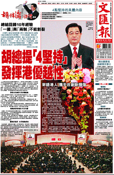 胡錦濤主席昨晨在香港會議展覽中心,為特區行政長官曾蔭權、各主要官員監誓後發表講話表示,回歸10年,對「一國兩制」的事業來說,具有前無古人的開創性意義。在10年實踐中,獲得許多寶貴經驗,其中最重要的有四點。