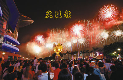 ■煙花匯演吸引數萬市民圍觀。本報記者高仲明 攝