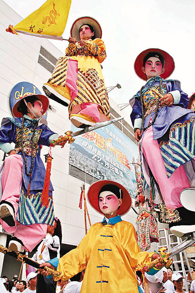 10項跳傘的演出,以「赤子回歸」最具代表性,跳傘員帶著國旗和香港特區區旗從天而降,區旗降落一刻象徵香港回歸祖國。活動籌委會執行主席鄭耀棠表示,跳傘隊昨早9時已於石崗起飛,但雲層低且厚增加跳傘難度,要在天空打圈兩小時才等到適合時機表演,順利做出多個高難度的精彩動作。他稱,昨日活動氣氛歡愉,大會詢眾要求今午3時於維園草地「添食」一場,市民毋須門票便可免費入場觀看。