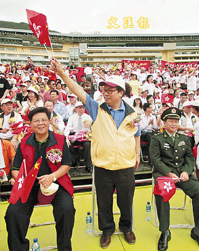 【本報訊】昨日天氣陰晴不定,令慶祝回歸10周年活動增添變數,尤其是跳傘活動能否順利演出,真是望天打卦。幸而,八一跳傘隊成功在厚雲中突圍,籌備委員會執行主席鄭耀棠亦興致勃勃地問觀眾「我出來跳,好不好?」觀眾隨即拍手歡呼支持,棠哥於是笑說:「我出來跳,只會跌死我!」可能上天也不想棠哥冒險試跳,馬上用滂沱大雨作出否決,棠哥再「補飛」,說:「淋一淋雨,即時醒神!」本報記者曾慶威 攝