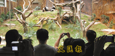 「樂樂」、「盈盈」抵港兩個多月後,昨天終於正式露面,讓市民和各方遊客觀賞牠們的「私生活」。兩隻熊貓在熊貓館開放初期顯得較為害羞,只願在活動區團團轉,直到護理員以食物引誘,才成功吸引牠們出來。過不了多久﹐牠們便適應了熱鬧場面,開始如常玩耍、走動,「盈盈」玩累了,不顧儀態大字形趴在木架上睡覺;小「樂樂」更熟不拘禮,就在大家面前表演「屙臭臭」,即席大便起來,引得各遊客大笑。
