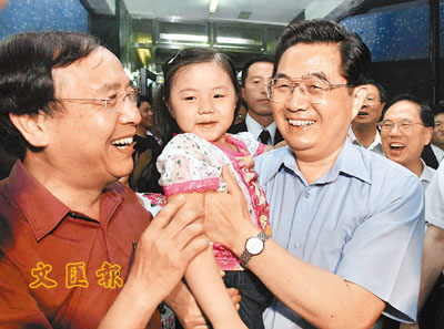 ■6月29日,胡錦濤主席在馬鞍山錦豐苑看望居民,親切地抱起一名小女孩。