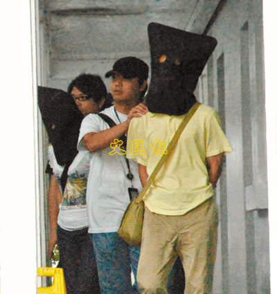■一名男子,涉嫌在山頂凌霄閣偷遊客銀包被捕,蒙頭被警員押署調查。