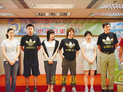 「中國文體明星北京奧運宣傳助威團」由百餘位文藝及體育界知名人士組成,他們特意在回歸10周年期間訪港,既與香港體育界共慶回歸,同時向港人傳遞北京奧運的訊息。前日陸陳漢語教學研究中心便邀得助威團中多位出色的奧運英雄,包括兩屆奧運會冠軍及女子羽毛球雙打夢幻組合之一的葛菲、羽毛球男子單打世界冠軍董炯、女子足球隊成員高紅、溫莉蓉,以及世界競速滑冰冠軍暨北京奧組委火炬中心高級專家葉喬波及中國資深足球評論員張路等一行近10人,與中心一眾正就讀初中及小學的學生分享。