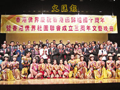【本報訊】(實習記者 唐美婷)香港僑界社團聯會日前邀請重慶市僑聯訪問團,出席假理工大學賽馬會綜藝館舉行、香港僑界慶祝香港回歸10周年暨香港僑界社團聯會成立3周年文藝晚會。當晚座無虛席,很多僑界人士均有出席。當晚文藝節目演出精彩,大家都投入欣賞演出。重慶市僑聯訪問團上月22日訪港後,隨即拜訪多個機構,包括震雄集團及香港中華總商會。