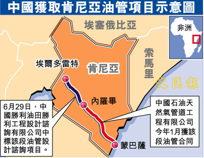 【本報訊】據新華網1日報道:肯尼亞管道公司29日說,中國勝利油田勝利工程設計諮詢有限公司擊敗其他11家競爭對手後,中標非洲肯尼亞西部地區一條輸油管道的設計諮詢項目。