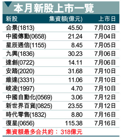 七月份上市的12隻新股集資額高達317.76億元(見表),若計及其他盛傳會陸續上市的新股,集資額將達約790億元,令全年集資額可超越1,800億元。上周截止公開發售的維達國際(3331),市傳其公開發售部分錄得逾100倍超額認購,該公司擬以上限3.68元訂價。