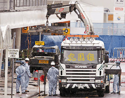 ■調查人員將被燒的吉普殘骸吊走,作進一步調查。 美聯社
