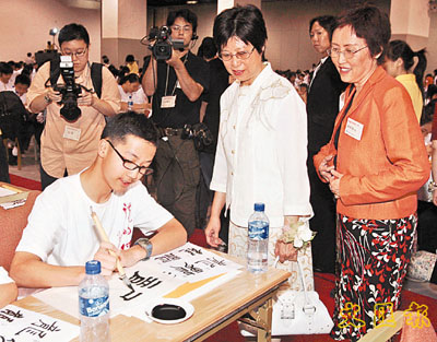特首夫人曾鮑笑薇出名寫得一手好書法,她昨日再次大顯身手,聯同其書法老師戚谷華出席「龍的傳人─萬『龍』情繫慶回歸」活動,與逾千位來自粵港澳的青年學生享受揮筆弄墨之樂。