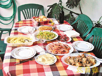 翌日Jose便駕車帶我到處遊覽,更邀請我到他父母的家,吃了一頓非常豐富的西班牙晚餐。西班牙食物雖不如法國及意大利般有名,但味道還是滿不錯的,如西班牙海鹽再配上海蝦,雖然很簡單,但已十分美味。除了各種海鮮外,西班牙還有數百種風乾火腿和香腸。所謂火腿,並不是在香港一片片的那種火腿,而是一隻完整的豬腿,在西班人的家看見這東西,是不足為奇的。火腿味道雖然比較濃烈,不過只要配上長麵包,便會覺得很甘香。另外值得一提的是西班人跟中國人一樣,會吃動物的內臟,甚至是腦袋,由此可見,歐洲人與我們一般認定的外國人,其實不盡相同。