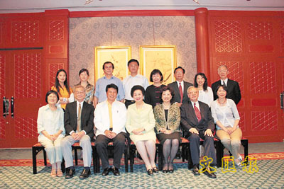 中華海外聯誼會榮譽理事、梁潔華藝術基金會主席梁潔華博士(前排中)昨晚宴中國文聯副主席覃志剛(前左三)等專程來港參加「慶祝香港回歸十周年 中華情—全球華人書畫世紀大聯展」開幕式活動的中國文聯代表團成員及香港、台灣和海外的參展書畫家。其中包括本報副社長劉永碧(前右三)、中國書協副主席趙長青(後左四)、 美協事業發展部研究員咸宜、畫家胡宇基伉儷(左一和二、美國)、歐豪年(右二、台灣)、姚迪雄(後左三、澳洲)、香港藝發局視藝組主席李錦賢(後右三)、梁潔華藝術基金會董事姚守一等(後右一)。