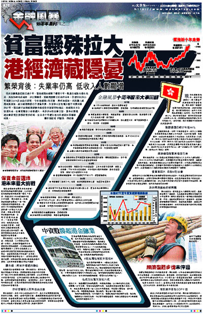 亞洲金融風暴眨眼已過十年,香港經濟也經歷了傳奇十年。風暴引爆股市樓市泡沫,其後科網泡沫爆破、沙士肆虐等,對經濟衝擊之巨前所未有。幸得中央於03年落實CEPA及自由行政策,令本港經濟V形反彈,高峰浪接浪。然而驕人經濟成果背後,部分經濟環節已不復當年勇,失業率以至財富分配不均情況甚於97年。恆生銀行首席經濟師關永盛接受本報訪問時指出,港經濟未完全收復失地,社會貧富收入差距擴大,有步向M形社會之勢,實有必要透過社會政策及稅務政策作紓解,在未來十年讓全港市民都能共享繁榮成果。