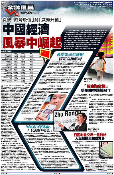 亞洲金融風暴爆發十年後,區內經濟浴火重生,當年中國以近乎封閉的金融體成功避險,更成為風暴後經濟發展得最快的國家。歐美國家由當年威脅人民幣貶值到目前威脅人民升值,可謂世界風水10年輪流轉。10年來,中國經濟發展步伐之快冠絕全球,期間不僅GDP翻近兩番至去年底的20.94萬億人民幣,位列全球第四,外匯儲備亦增至1.066萬億美元,成為全球外儲最多的國家。雖然經濟表現亮麗,然而中國仍認真地吸取區內金融危機的經驗,不斷完善金融體系,防範新的風險。國務院總理溫家寶日前更指出內地經濟存在「四不」作警惕,呼籲全國上下居安思危。